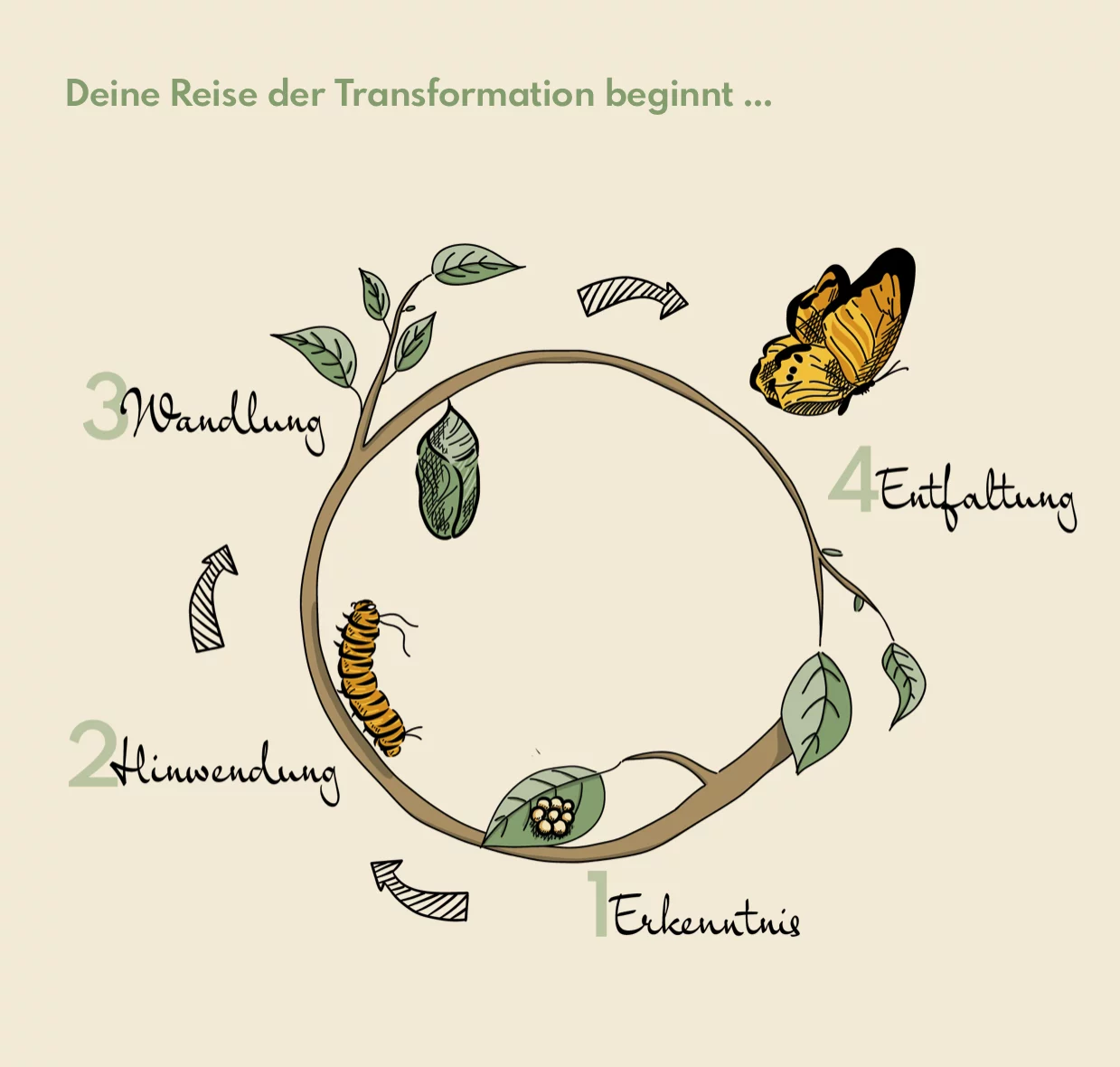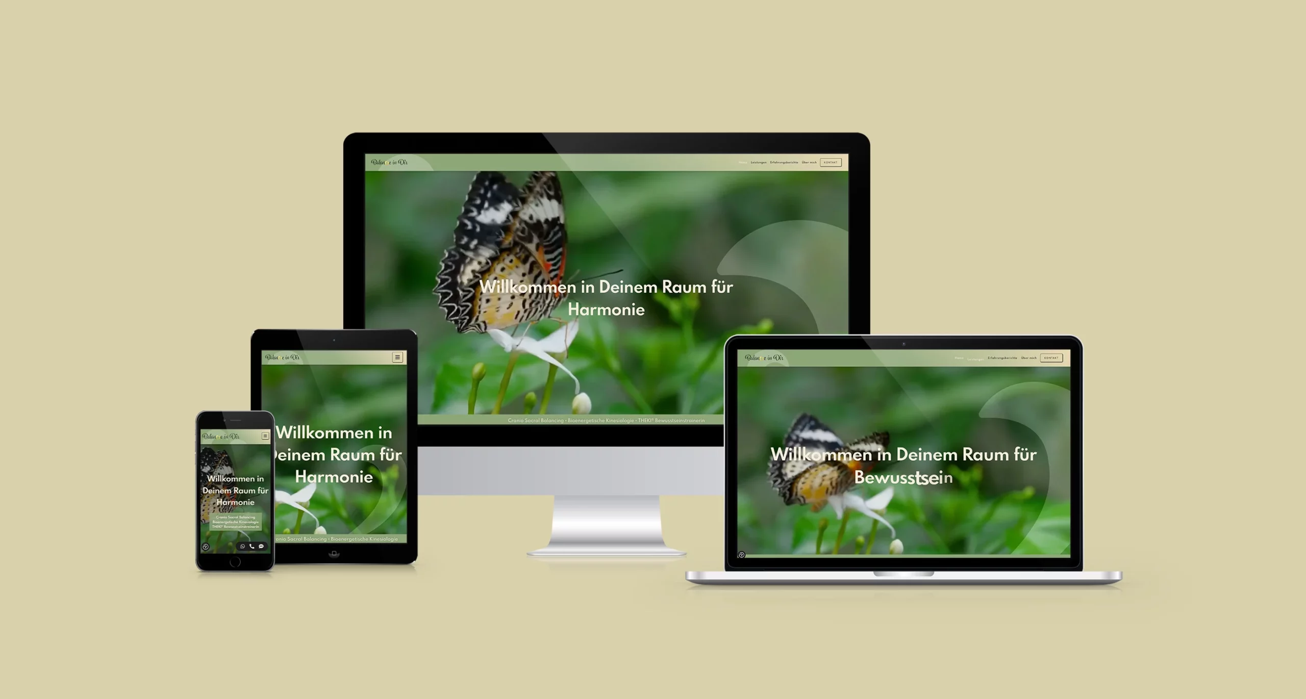 Im Webdesign setzt sich die visuelle Sprache fort. Es strahlt Ruhe aus und macht gleichzeitig den Prozess der Transformation sichtbar – von der Schwere zur Leichtigkeit, von der Blockade zur Balance. Passend zum Thema habe ich zur Veranschaulichung im Webdesign den Entwicklungsprozess des Schmetterlings als zentrales Gestaltungselement gewählt.